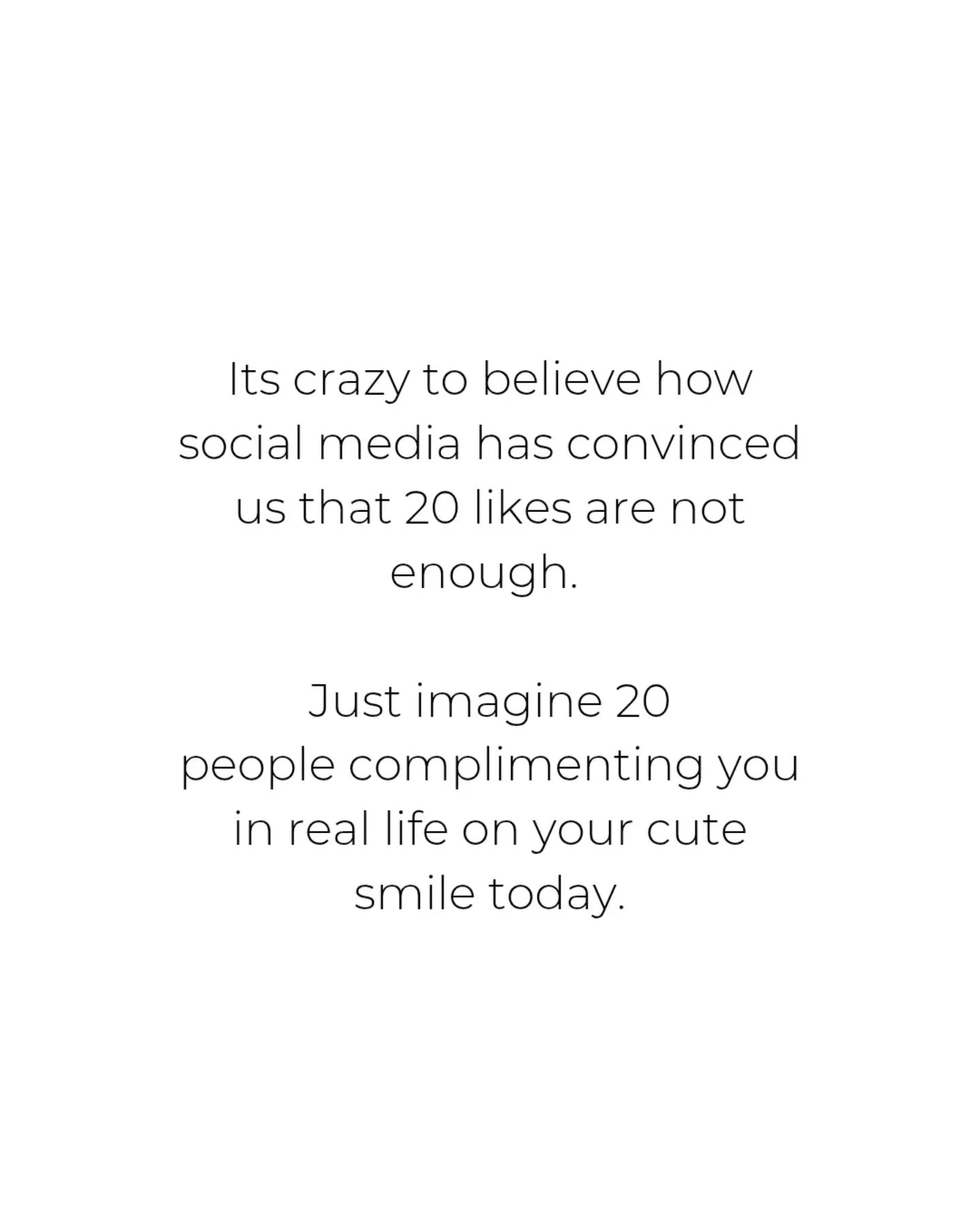 View fullsize We’ve been conditioned to think that 20 likes isn’t enough—but imagine 20 people walking up to you in real life just to say, “Hey, your smile is gorgeous.”